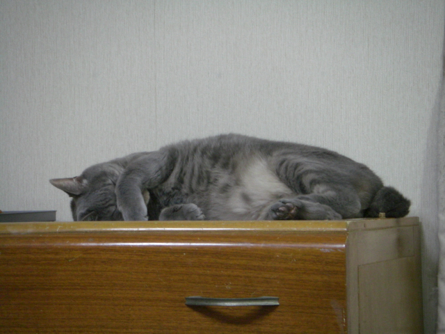 たんすの上の猫ちゃんです。まぶしいと前足で目を覆って寝てるのがかわいいです^^