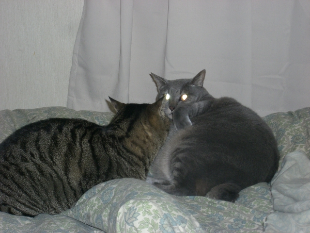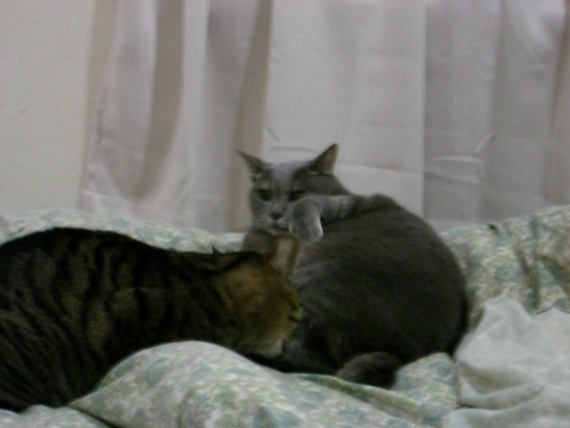 うちのネコ(猫)ちゃんず、時々じゃれる、というか戦いを始めます。(小さい猫のほうがふっかけるのですが。。。。)