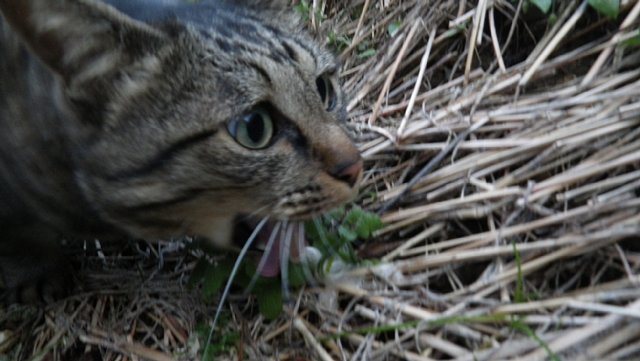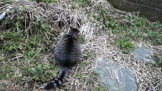 おとなり猫さんが庭でウック、ウック言ってるのでチャンスと思ってカメラを向けると・・・・